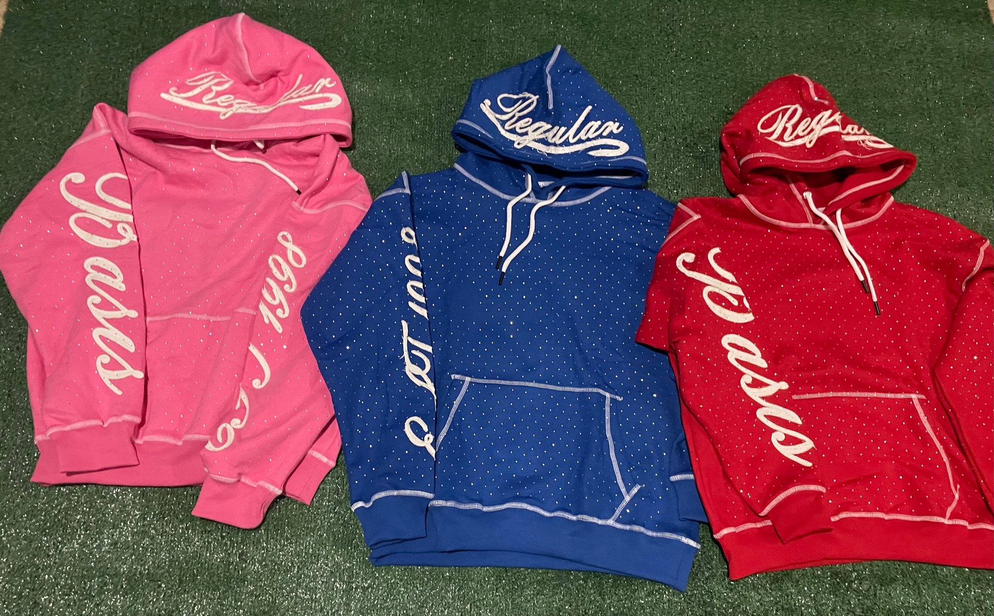 Soft, high-quality fabric for all day comfort. All over micro-dot rhinestone pattern for a unique look. Bold "REGULAR" brand signature script logo on hood and sleeves. Contrast stitching details. Adjustable drawstring hood and kangaroo front pocket, regular fit.